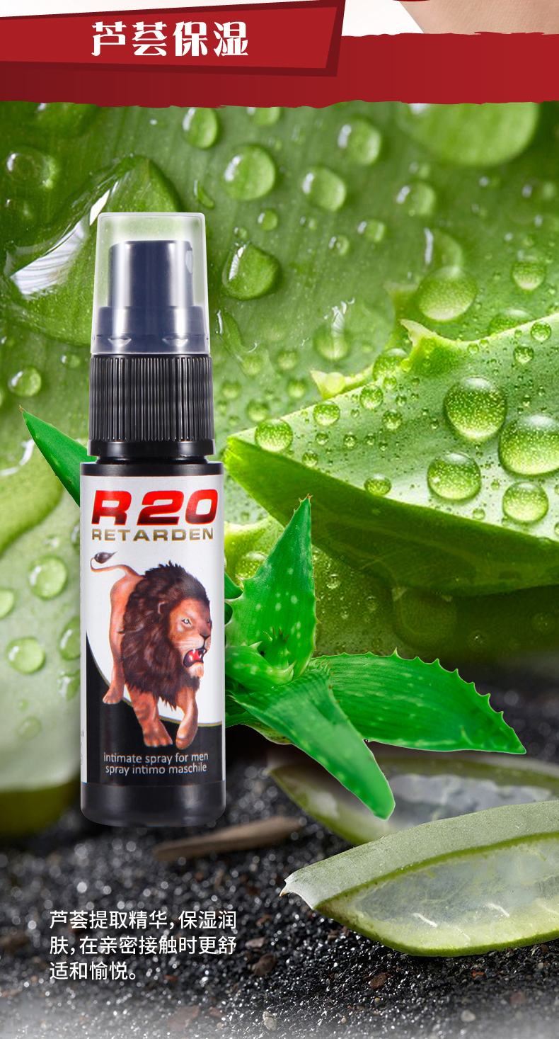 | 延迟喷洒以防早泄。在性交前几分钟应用它,并享受完整而持久的性交。 | R20是专门为男士外用龟头配制的亲密阻燃喷雾剂。它对男性生殖器区域的即时冷却作用有助于延长性交时间。-兼容乳胶-经皮肤科测试 使用注意:事前3分钟左右使用,避开尿道口,在龟头上喷2到4次并涂抹均匀 |